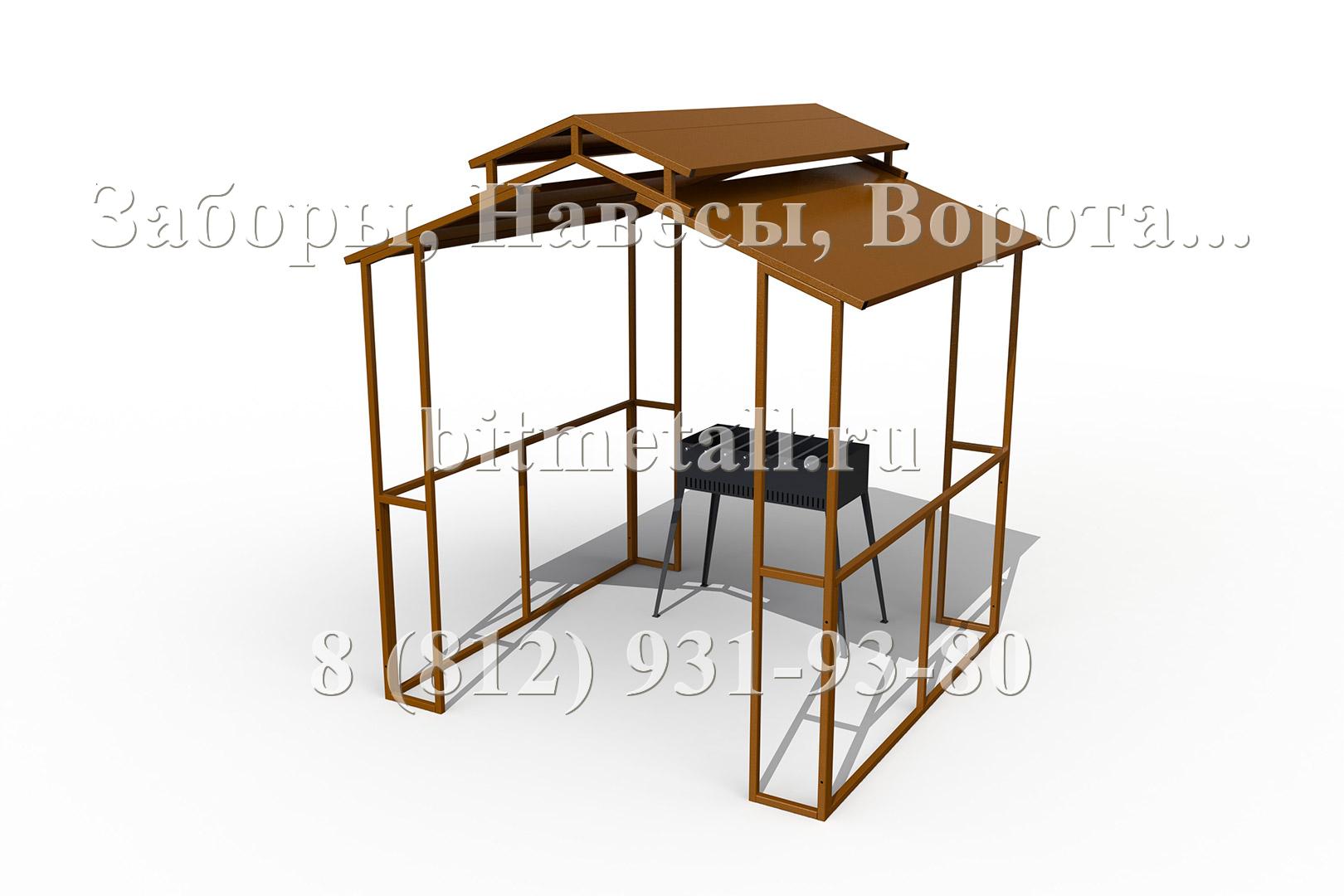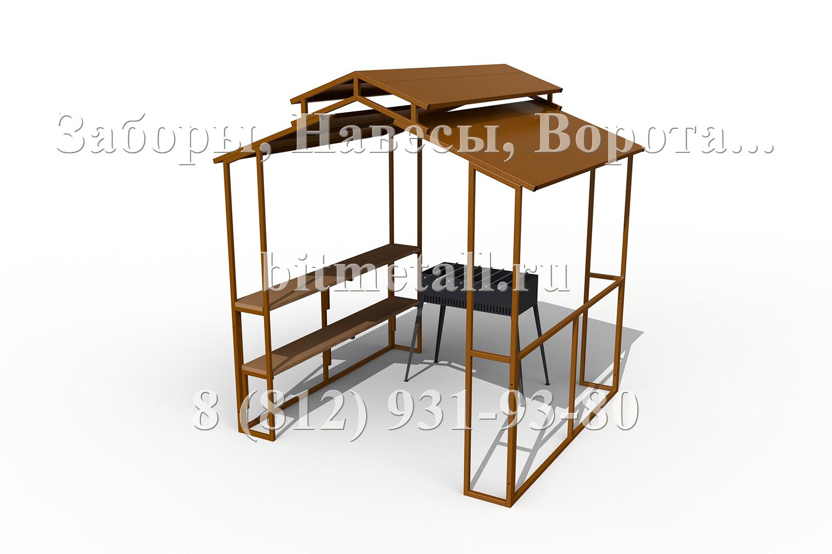 Базовый вариант навеса над мангалом (барбекю) состоит из стоек, боковых рам-перемычек и крыши. Все основные элементы конструкции изготовлены из профильной трубы и листового металла. Навес окрашен порошковой полимерной атмосферостойкой краской. Дополнительные опции в виде столешницы, полок и скамьи имеют в своей основе мебельный щит из натурального дерева и обработанный защитно-декоративным покрытием. Крепеж используется стандартный - оцинкованный. Открытые торцы труб закрыты пластиковыми торцевыми заглушками.