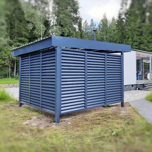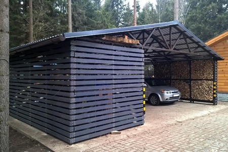 Вариант на фото имеет размер 8 х 2 метра и максимальной высоты 2 метра. Служит для хранения хозяйственного инвентаря, контейнеров для раздельного сбора мусора, мототехники. Данная постройка имеет самодостаточный внешний вид и гармонично смотрится как в качестве отдельно-стоящей постройки, так и пристроенной к стене дома, гаража и пр.